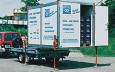 (Lift) Speditionsanhänger mit hydraulischer Alu-Ladebordwand TopLift21 und mit patentierter Ladungssicherung TopZurr21. Auf Wunsch mit Überfahrklappe vom Anhänger in das Zugfahrzeug. |